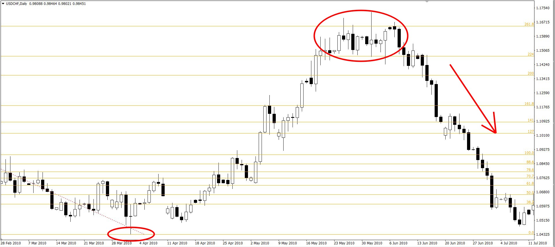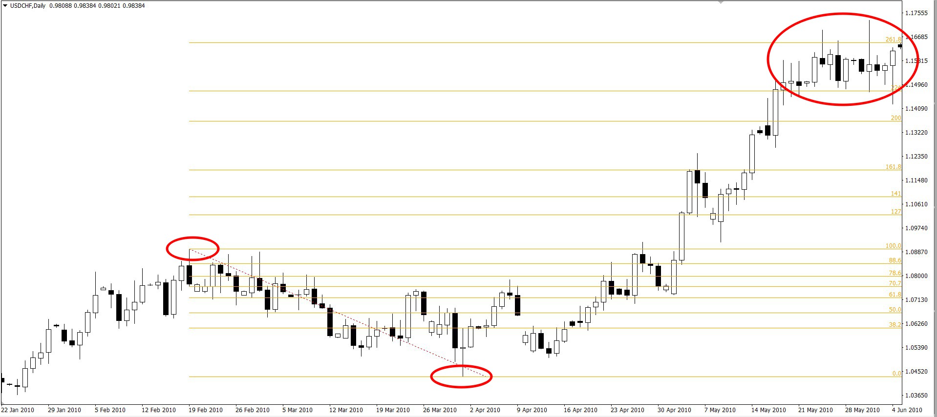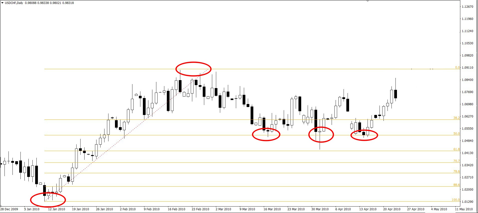 下圖為2010.01.11的美瑞兌價格上漲到2010.02.19的價位後回落,我們以此區間作為高低點使用FIBO工具測量回撤,發現價格回落在0.5的位置後停止,因此0.5的位置明顯成為一個有效的支撐區域,把價格抵擋在這個位置三次,此後價格開始往上回升。