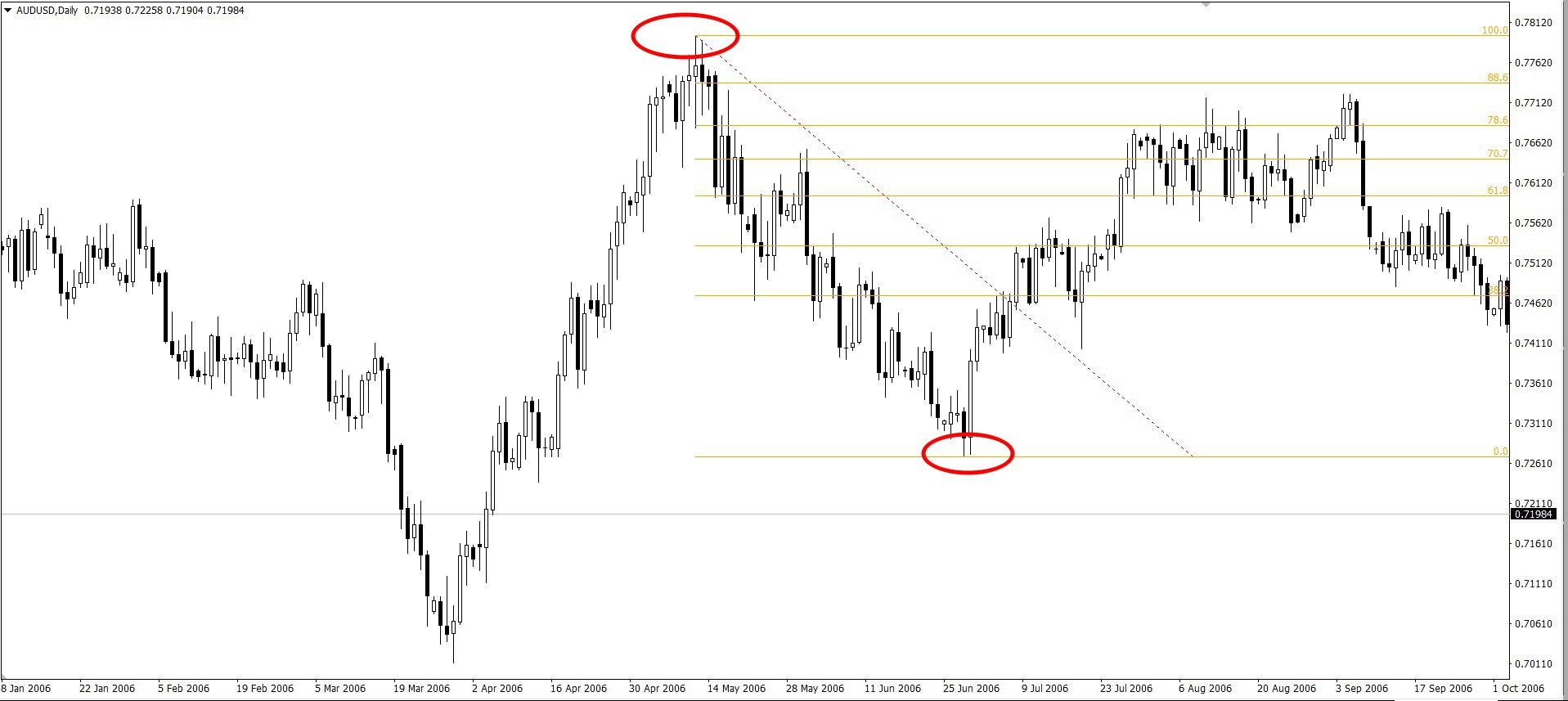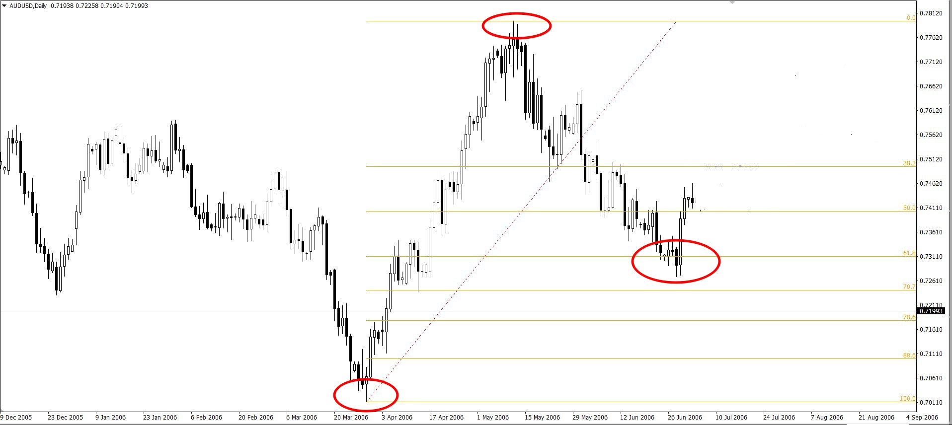 下圖是澳美兌從2006.03.29的價格低點一路上漲到2006.05.12的高點後開始回落,我們以這兩個價位使用FIBO回撤工具後,發現價格落在0.618的位置開始上漲。
