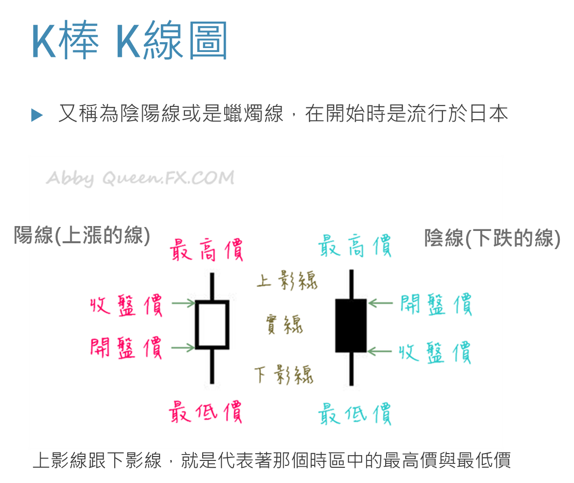 1.台灣股票的K棒,如果是上漲的K棒,中間的實體為紅色;相反下跌K棒,中間的實體為綠色。