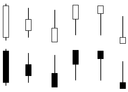 這種K棒反映出市場明確的方向,例如左邊的白色K棒,市場有一個強勁的上漲力道,把價格往上推升以至於收盤接近最高價,形成一個實體很長的K棒。