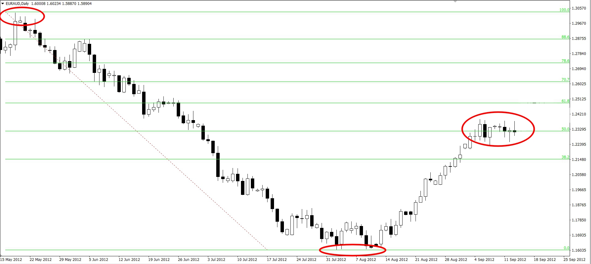 從下圖中可以看出,歐澳兌價格從2012.05.18開始下跌到2018.08.02的位置開始回升,這時我們選定這兩個價位來使用FIBO回撤,會發現價格剛好停在了0.5的位置震盪,而如果我們剛好在這時進場作空。
