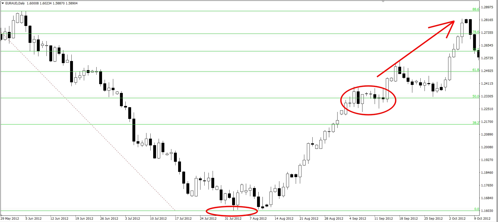 大家可以發現一件事,在這兩張圖表中,我們並沒有使用任何的壓力支撐區域,而是運用FIBO的回撤價位來當作潛在的壓力支撐位置。