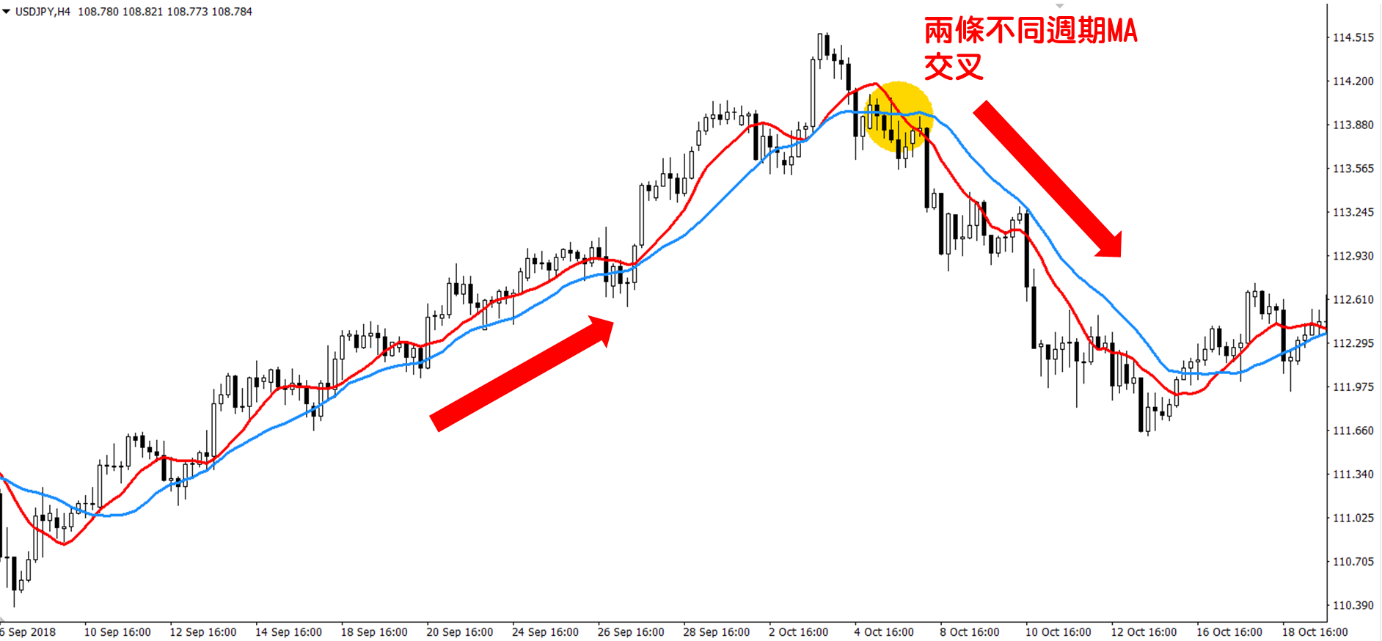 讓我們直接來看看美元兌日幣的4小時線圖。(紅色為10MA、藍色為20MA)