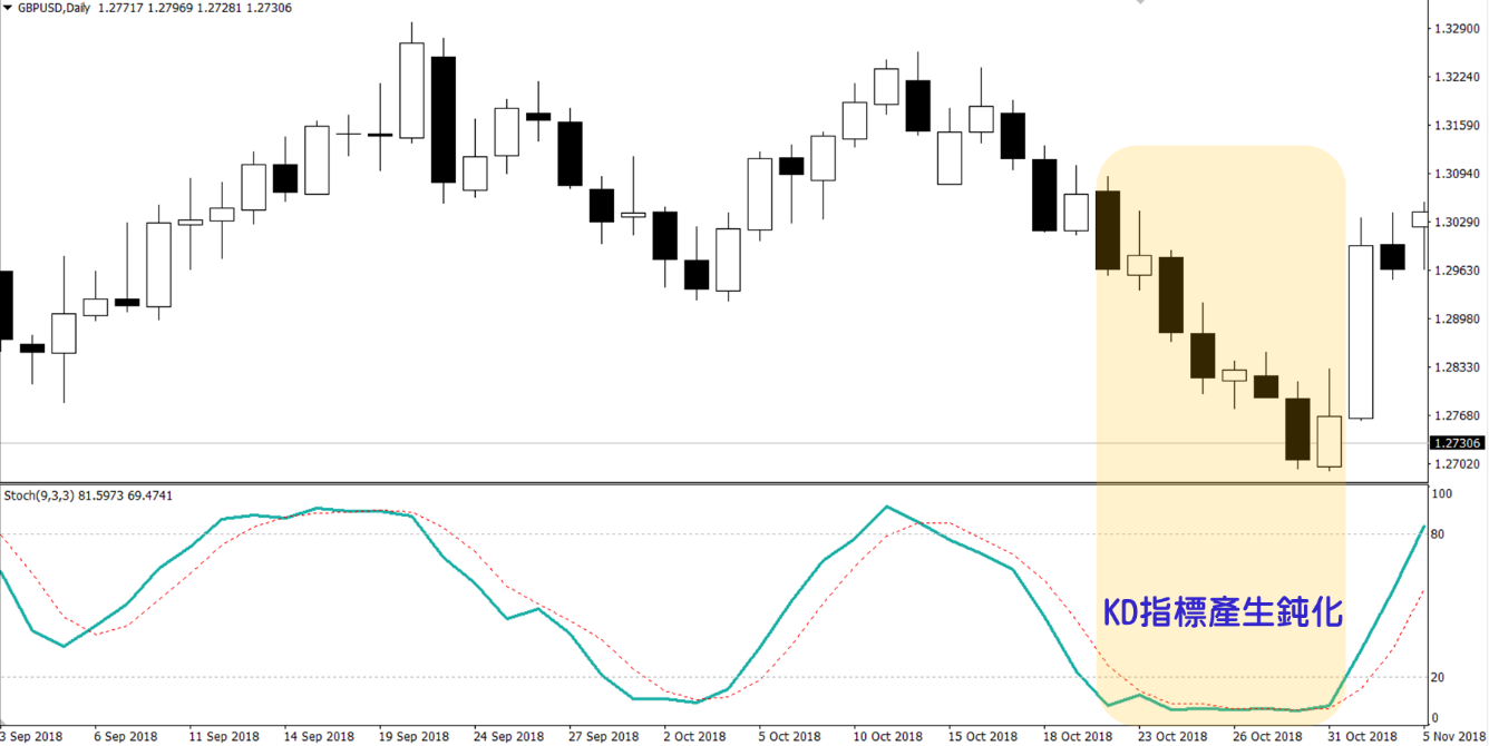 否則當價格長期處於超賣超賣區,像這樣的震盪指標KD就會面臨鈍化而失效。