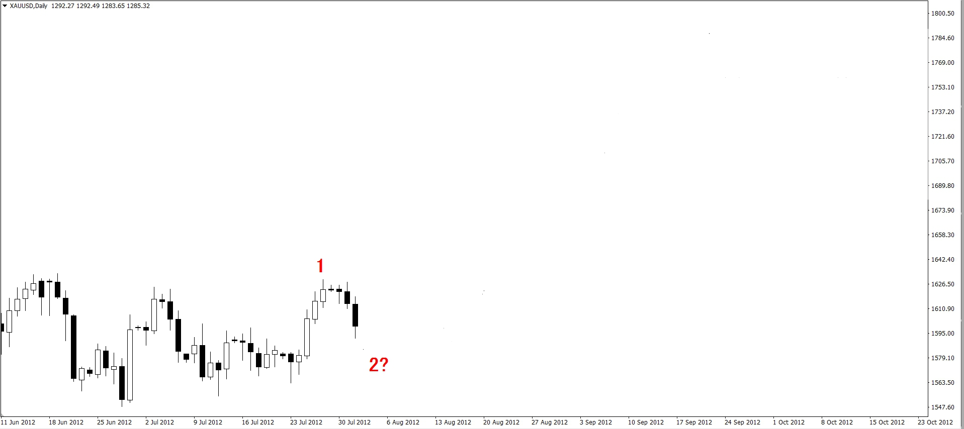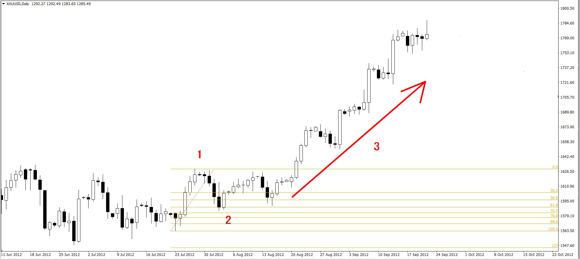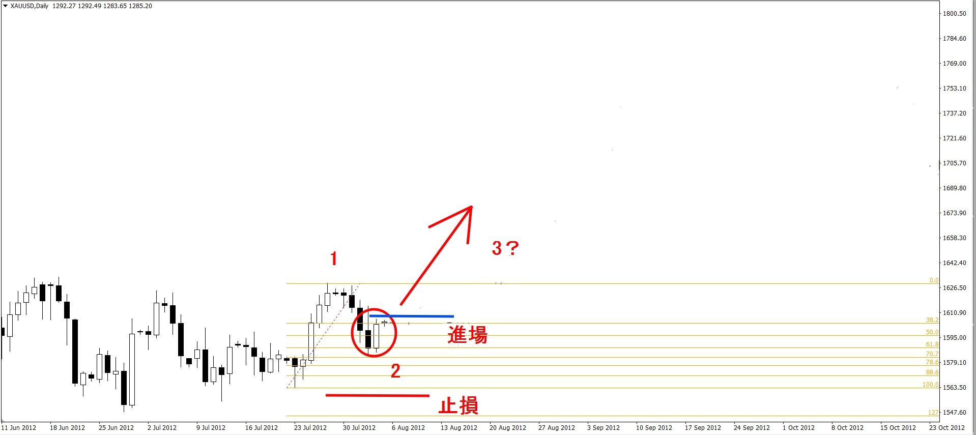 上圖的黃金在2012.07.25上漲後回落,我們先假定此為第1浪,我們準備要找尋第2浪的位置,就可以以前幾章所學的FIBO回撤工具來幫我們找尋2浪的終點,也就是3浪的起點。