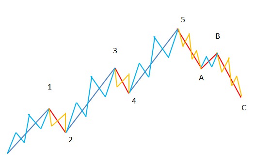 在調整浪中,A浪跟C浪都各由一組推進浪組成。