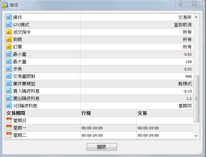 從圖上可以看到,買入隔夜利息為-6.15,也就是作1手的多單,每隔一日交易商會收取6.15美元,但這不是固定的,跟點差一樣,手數縮小,庫存費也會縮小,作0.1手多單則變成0.615,以此類推。