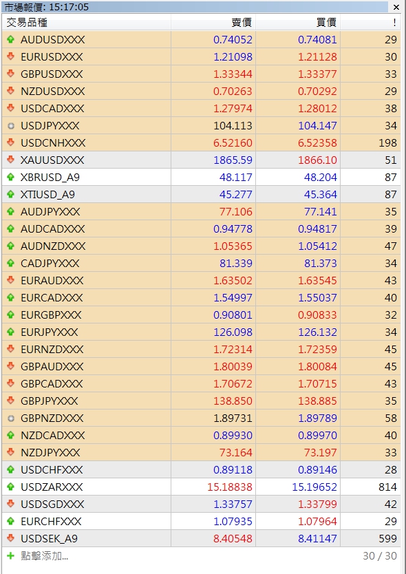 以EURUSD(歐元兌美金)為例,後方的點差成本顯示30,表示下單1手所支出的費用為30美金,下0.1手則是3美金,而下0.01手為0.3美金。