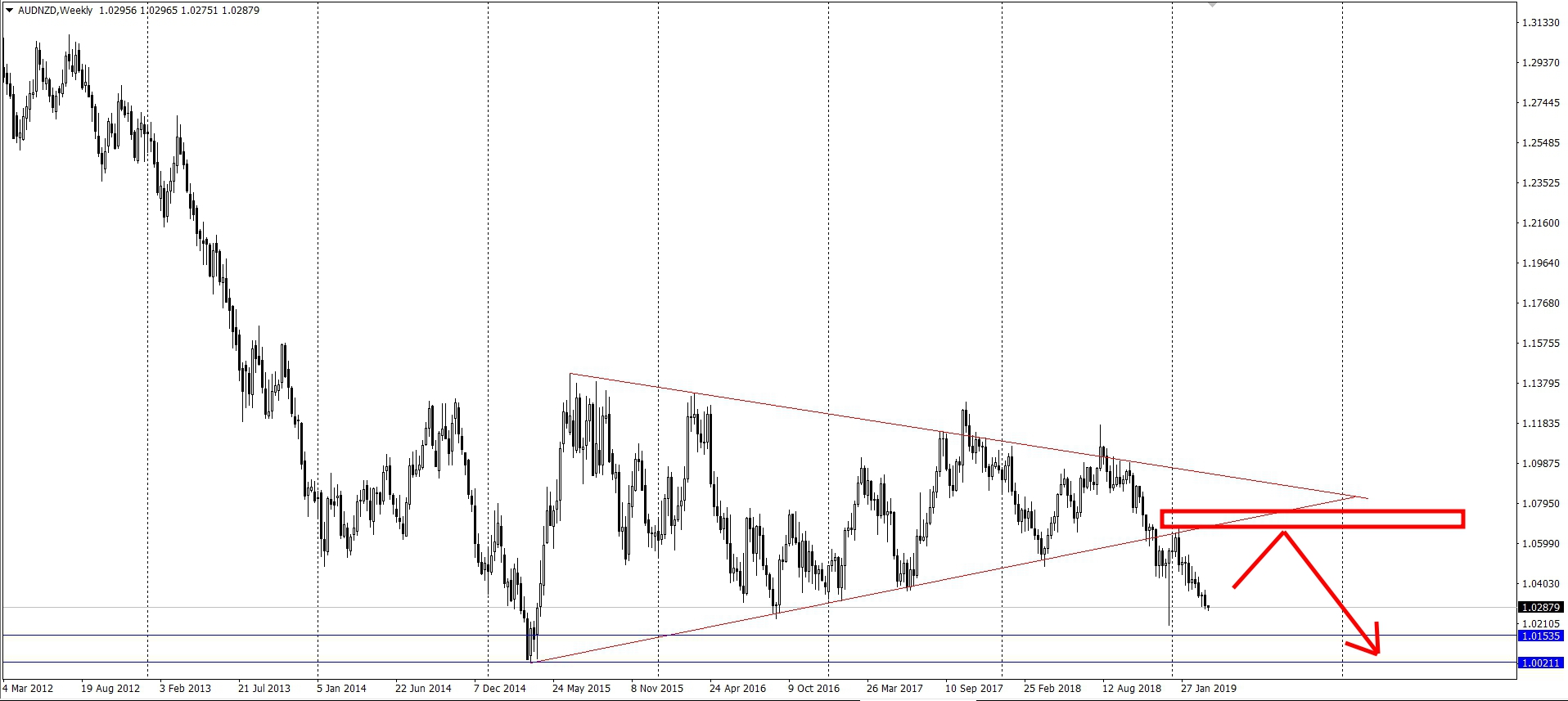 澳紐兌算是一個超級冷門的貨幣,我們從週圖來看,是一個很明顯的下降趨勢,因此在作單方向上盡量保持空方為主,切到日圖後,澳紐兌已經突破了整理很久的區間,目標很明顯就是往下繼續探底啦!但現在追空的話,風險會較大一點,建議等它 回抽上來,再空他比較OK喔!