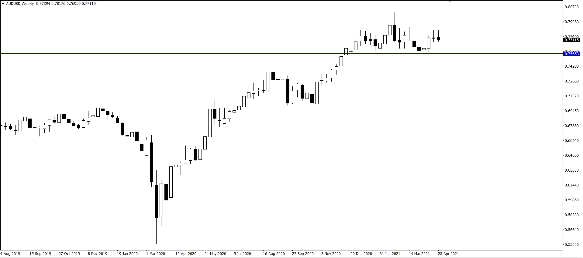 2021年5月澳幣兌美金的價格走勢圖(週圖)